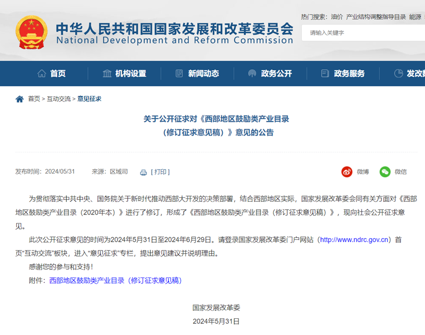 2024年5月31日,国家发展改革委员会正式发布通知,对《西部地区鼓励类产业目录(修订征求意见稿)》公开征求意见。