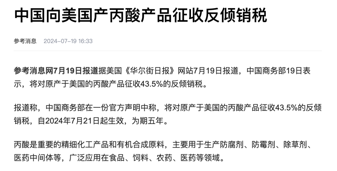 对原产于美国的进口丙酸产品征收43.5%的反倾销税!| 丙酸是部分除草剂和农药中间体的原料