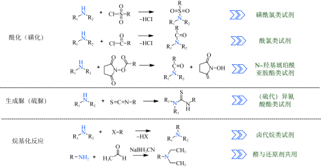 苯胺和取代苯胺类杂质具有氨基基团,氨基可作为衍生化反应的位点,常用的衍生化反应包括酯化(酰基化)反应和烷基化反应,同时也有一些特殊的反应如生成脲或者硫脲的反应(图5)。酯化(酰基化)反应中涉及到的衍生化试剂包括磺酰氯试剂和酰氯试剂,生成硫酰胺和酰胺类衍生化产物。N-羟基琥珀酰亚胺酯类试剂通过与氨基反应伴随N-羟基琥珀酰亚胺基团的离去生成酰胺类衍生化产物,这类试剂的应用相对较多反应条件温和。生成硫脲的反应一般采用异氰酸酯类衍生化试剂,例如氨基糖苷类抗生素的氨基与苯基异氰酸酯反应后,可提升其在质谱上的离子化效率。烷基化反应的衍生化试剂包括卤代烷烃类试剂以及醛和还原剂共用的组合试剂,其中醛和还原剂共用的组合衍生化试剂常用甲醛和硼氢化钠组合与氨基酸反应可以生成氨基的二甲基化产物,通过引入不同稳定同位素标记的醛类可以实现基于氨基多重标记检测蛋白质中特征氨基酸。