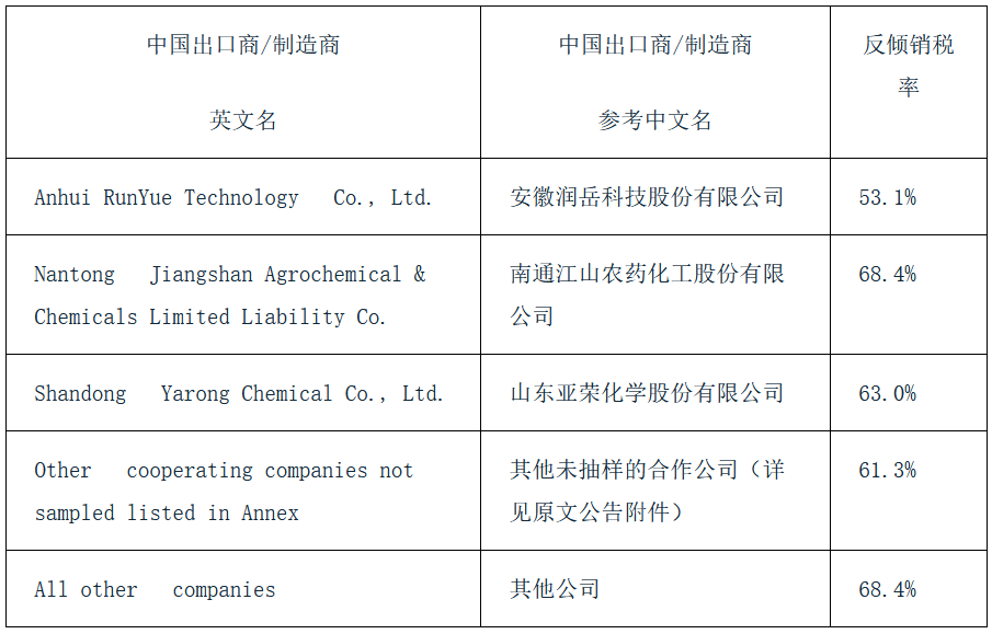 Esters)作出反倾销终裁,决定对涉案产品征收53.1%~68.4%的反倾销税,税率详见附表。涉案产品的欧盟CN(Combined