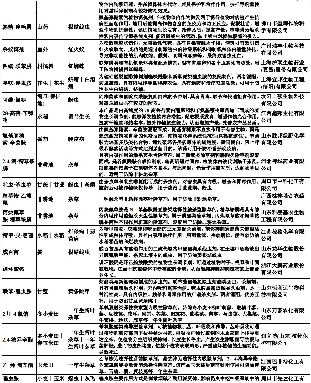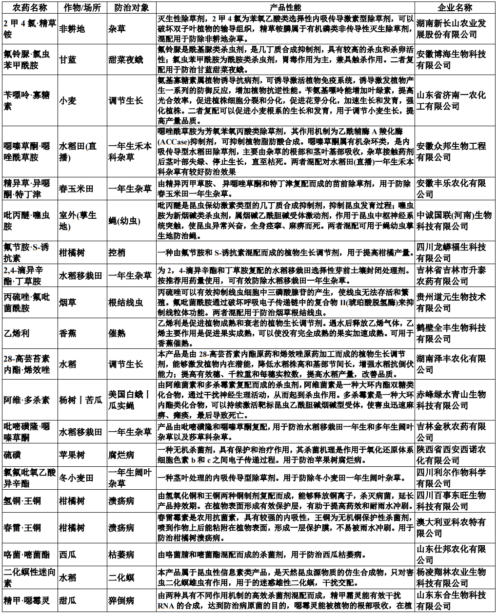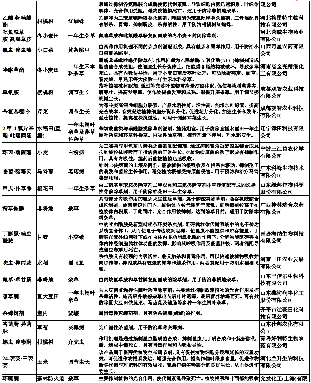 仲农要:包括如下原药,对应的产品性能和涉及企业如下: