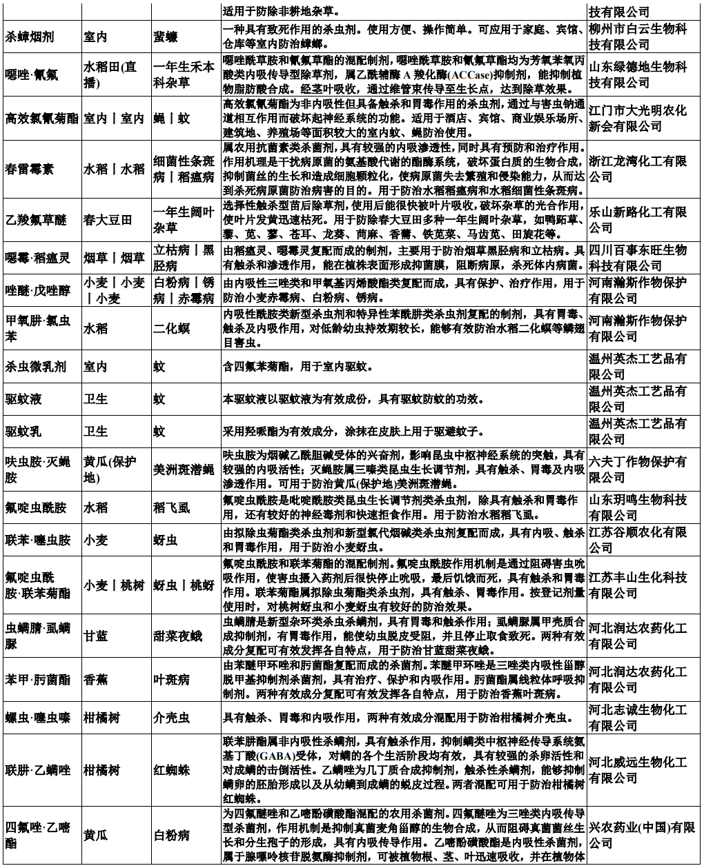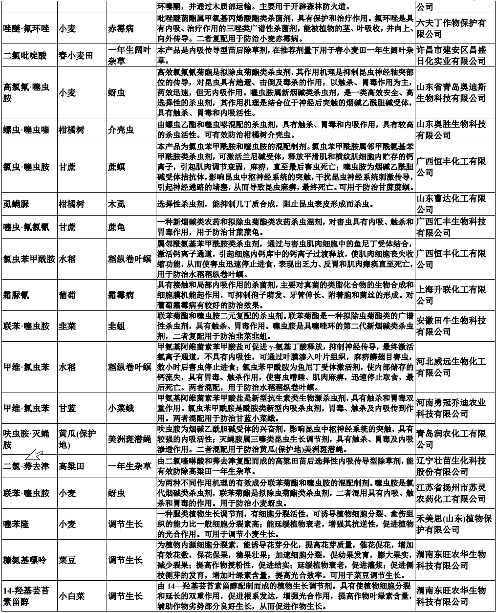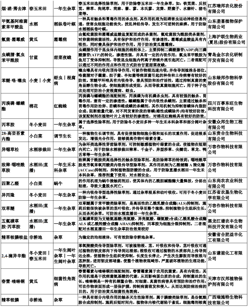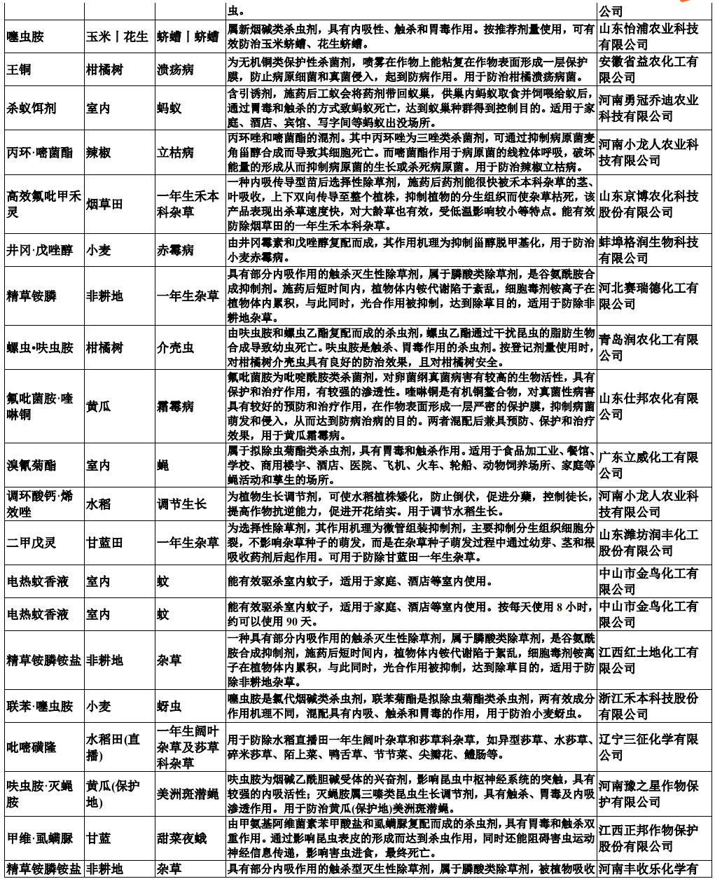 仲农要:包括如下原药,对应的产品性能和涉及企业如下: