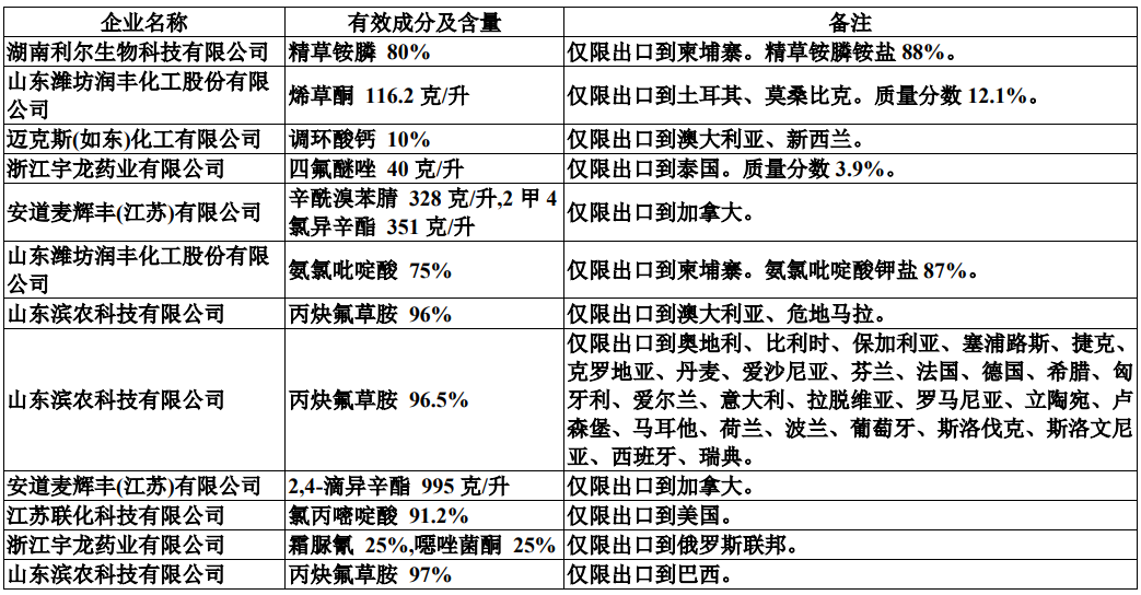 仲农要:出口专供方向,包括如下制剂和原药产品: