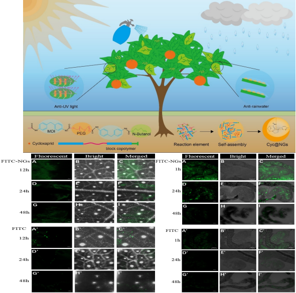 中国农业科学院植物保护研究所智慧植保创制创新团队在国际知名期刊《Journal of Advanced Research》(IF: 11.4)发表题为“Fabrication of nanogels to improve the toxicity and persistence of cycloxaprid against Diaphorina citri, the vector of citrus huanglongbing”的研究论文。该研究合成一种抗紫外光解、抗雨水冲刷的抗性治理新产品—环氧虫啶水凝胶,显著提高药剂在叶片和昆虫中肠内的穿透能力和稳定性,与环氧虫啶可湿性粉剂相比对抗性柑橘木虱的田间防治效果提高20%以上。