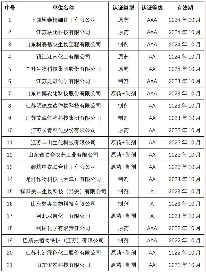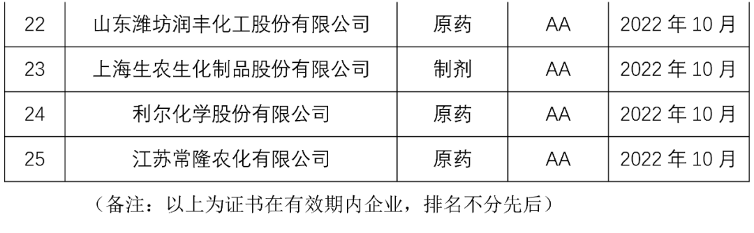 截至2024年10月,取得“中国农药行业HSE管理体系合规企业”认证并在有效期内的农药企业25家,名单如下:
