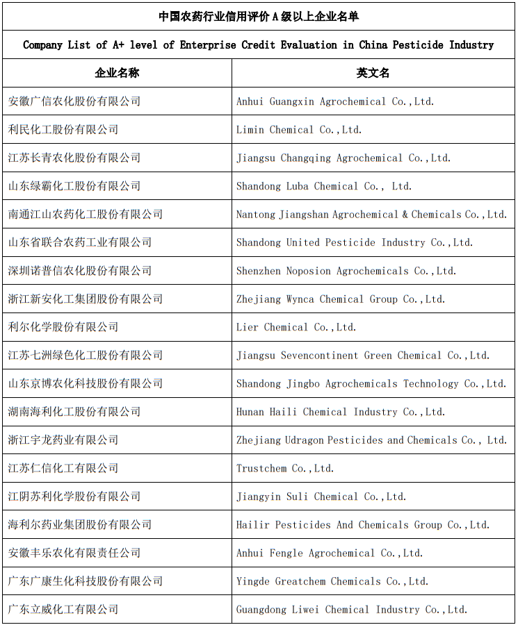 为了不断提高农药企业诚信建设水平,推动企业诚信自律,提升企业信用管理水平,培育、评价、宣传、示范一批信用管理严格、社会信誉良好、社会责任感强的企业,提升企业信用风险防范能力,促进企业可持续发展,共建社会信用体系,加强和创新社会治理,营造优良营商环境。中国农药工业协会决定开展2024年度农药企业信用等级评价(以下简称“信用评价”)工作。经企业自愿申报、材料审核、等级初评、专家评审、社会公示,最终评出中国农药行业信用等级评价A级以上企业38家。