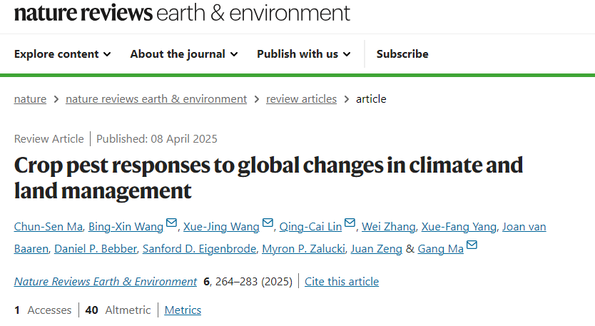 Nature Reviews Earth & Environment(5年影响因子54.6,Environmental Science 1/358; Geosciences, multidisciplinary 1/254)上发表了题为Crop pest responses to global changes in climate and land management的论文。是我国在全球热点领域发表的重要进展,也是迄今为止植物保护领域在该期刊发表的第一篇论文。