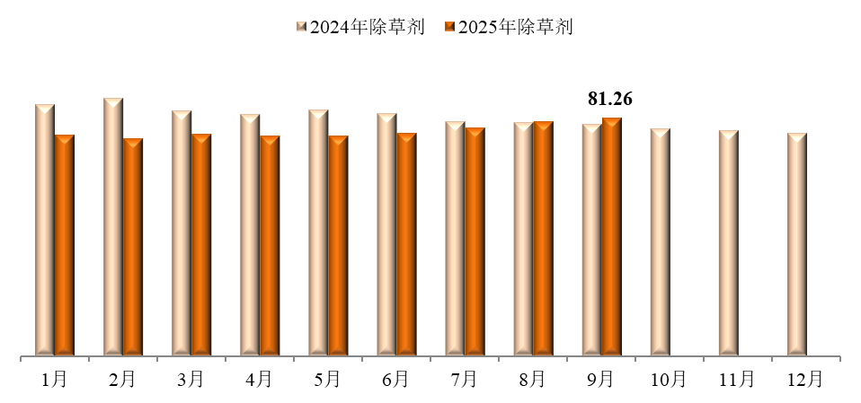 9月,除草剂价格指数为81.26,环比上涨1.53%,同比上涨2.70%。监测在内的44种除草剂产品中,加权平均成交价格环比上涨的18种,环比持平的2种,环比下跌的24种;加权平均成交价格同比上涨的14种,同比下跌的30种。