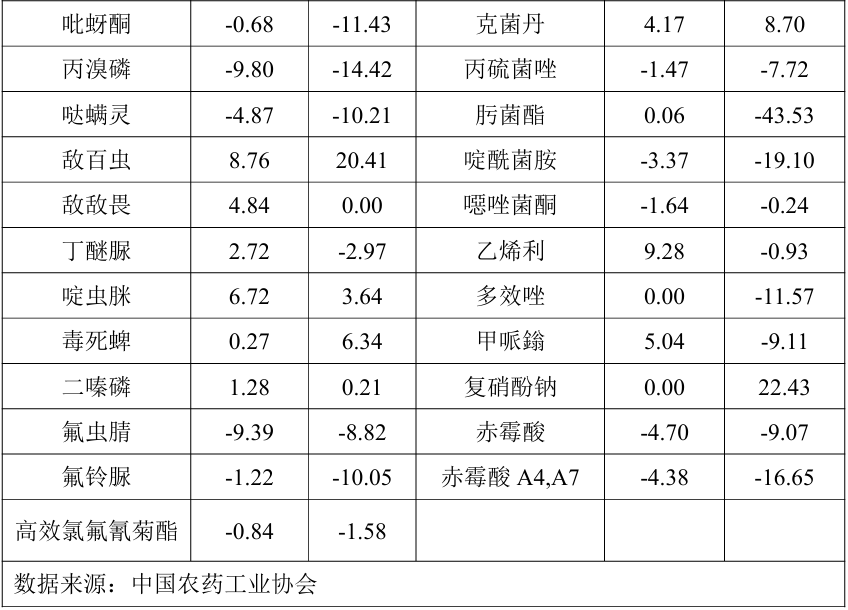 本月,除草剂价格指数继续保持上涨势头,其中百草枯、氟乐灵、乙草胺、莠去津等原药加权平均成交价格上涨显著,带动除草剂价格指数上涨1.61个百分点;草甘膦市场供需稳定,价格较上月持平。杀虫剂价格指数环比回落1.59%,其中阿维菌素、丙溴磷、氟虫腈和乙酰甲胺磷原药加权平均成交价格环比分别下跌5.75%、9.80%、9.39%和2.02%%,主要系部分企业订单量和价格调整影响。杀菌剂价格指数继续小幅回落,环比下跌0.70%,多菌灵、代森锰锌、戊唑醇、丙环唑、苯醚甲环唑等大宗产品价格基本稳定,涨跌幅在±2%以内;醚菌酯、氟环唑和咪鲜胺加权平均成交价格环比分别下跌8.44%、4.56%和6.84%。