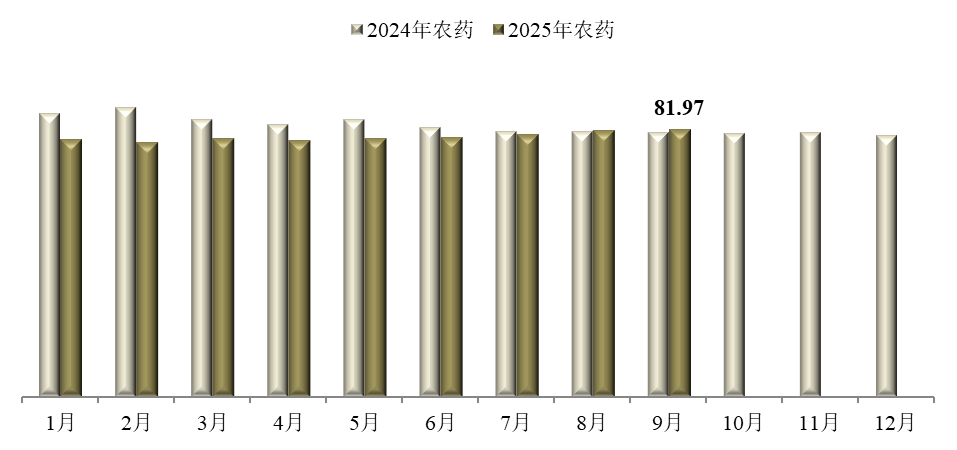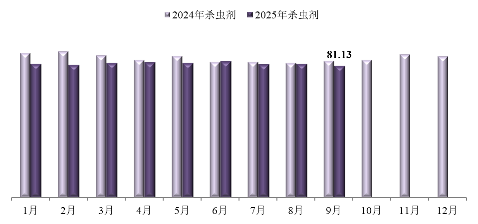 9月,杀虫剂价格指数为81.13,环比下跌1.59%,同比下跌3.47%。监测在内的36种杀虫剂产品中,加权平均成交价格环比上涨的16种,环比持平的1种,环比下跌的19种;加权平均成交价格同比上涨的12种,同比持平的1种,同比下跌的22种。