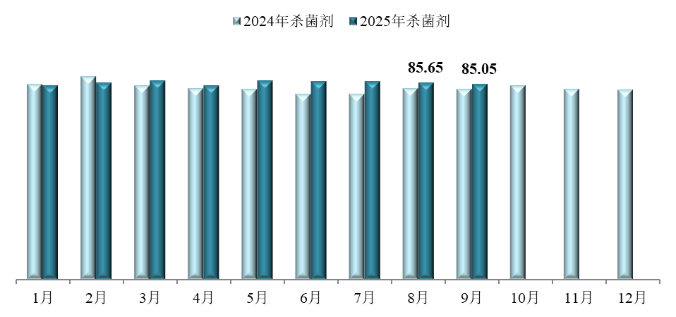 9月,杀菌剂价格指数为85.05,环比下跌0.70%,同比上涨2.58%。监测在内的31种杀菌剂产品中,加权平均成交价格环比上涨的11种,环比持平的2种,环比下跌的16种;加权平均成交价格同比上涨的8种,同比持平的1种,同比下跌的20种。