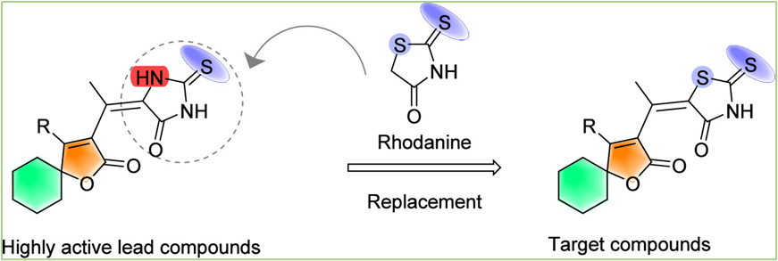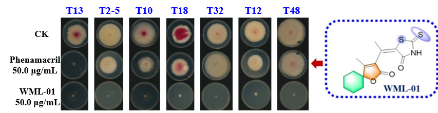 前人研究报道,含有螺环丁烯内酯结构的天然产物以及含有罗丹宁骨架的化合物具有多种生物活性,表现出较好的抗菌、抗病毒、杀虫、抗炎或抗肿瘤等作用。本研究将罗丹宁优势骨架引入到天然产物螺环丁烯内酯类化合物库中,设计了系列含有罗丹宁结构片段的螺环丁烯内酯衍生物(图1),根据构效关系进行了多层级优化,最终发现化合物WML-01对镰刀菌属真菌具有突出的抑菌活性。