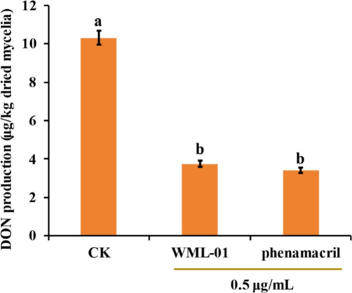 研究发现WML-01能够明显降低镰刀菌DON毒素的产生(图3):经WML-01(0.5 μg/mL)处理后,禾谷镰刀菌产生的DON量为3.78 μg/kg干菌丝体,显著低于空白对照组(10.28 μg/kg干菌丝体),且与相同浓度的氰烯菌酯处理组(3.60 μg/kg干菌丝体)相当。