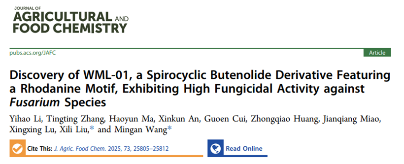 近日,中国农业大学理学院和植物保护学院联合在国际知名期刊《Journal of Agricultural and Food Chemistry》上发表了题为“Discovery of WML-01, a spirocyclic butenolide derivative featuring a rhodanine motif, exhibiting high fungicidal activity against