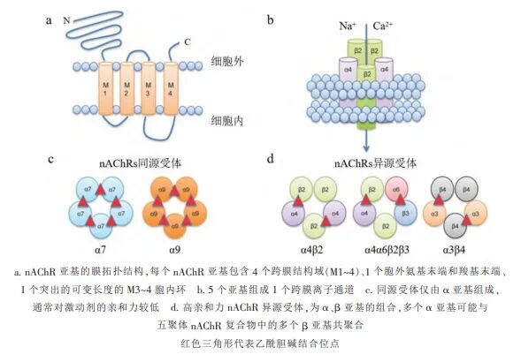 构成乙酰胆碱受体的亚型由组成它的亚基数量命名,例如(α4)2(β2)3 表示该亚型由 2 个 α4 和 3个 β2 组成。 当研究中不清楚亚型的具体组成时,可能会使用星号加以标注, 例如 α4β1*表示该亚型组成有 α4 和 β1,但同时可能还包含其他亚基类型。由此,烟碱型乙酰胆碱受体分为由同一亚基组成的同型五聚体和由不同亚基组成的异型五聚体。异型五聚体又因组成亚基是否同源分为同源异型五聚体(由不同的 α 亚基组成)和非同源异型五聚体(由 α和非 α 亚基组成)。